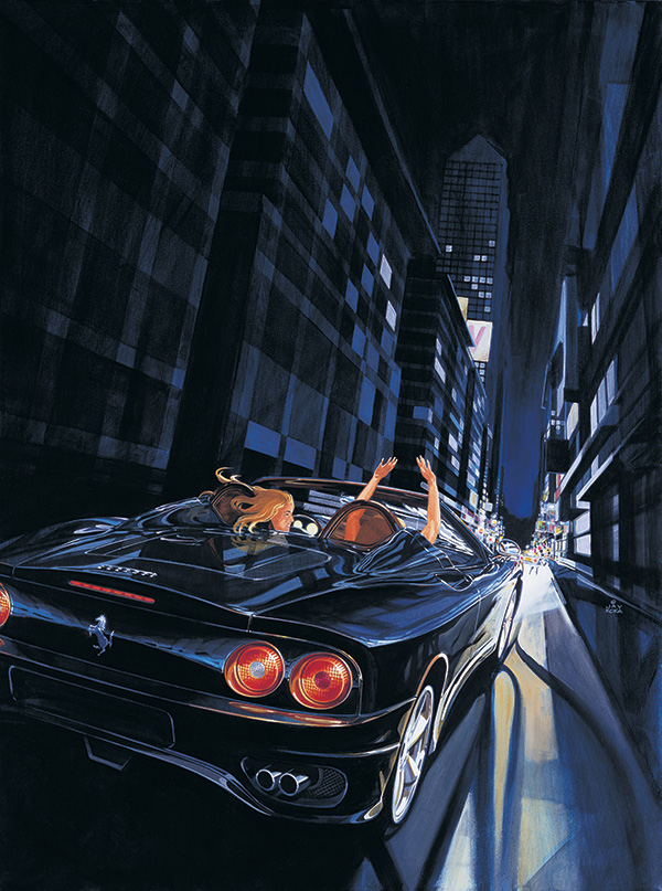 The 'Young Girl's...' painting inspiration came from The Mamas & The Papas song 'Twelve-thirty' which is more commonly known as 'Young Girls are Coming to the Canyon'. I'm exactly the right age to have been a fan of this group in the 60's and I happen to be listening to their 'greatest hits' CD in the Studio while contemplating a new painting of the 360 Spyder....the rest of the story is, as they say, in the painting." A large 36x48" canvas featuring the new Ferrari 360 Modena Spyder and the sheer joy of a quick ride.