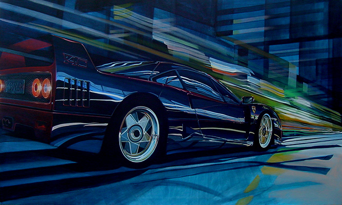 The car is almost completely defined by reflections...mostly dark, but full of brilliant splashes of light and the briefest hints that it is in fact a 'red' F40.