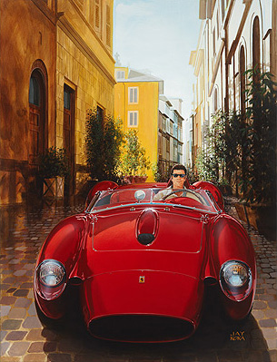 I got the idea for "Bored" while walking around the pit area of the track during a recent Cavallino Ferrari Classic. My wife has been to enough car shows and races to last at least two lifetimes and I often get the sense she would rather be somewhere else...anywhere else that does not involve cars. The girl in the painting is not my wife, she just represents the idea... a person completely unimpressed and unmoved while surrounded by some pretty impressive wheels.
