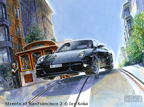 ”Like being frozen in the middle of holding your breath...” Inspired by the 2007 painting Streets of San Francisco, this new large painting was commissioned by a collector living in Switzerland. Like the 2007 work, it features a car launching off the crest of a hill... a Ferrari F430 F1 from the rear in 2007 and a Porsche Turbo... now from the front.